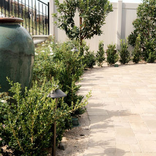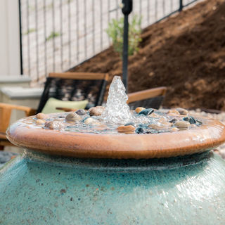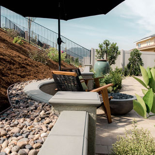 From new-build dust bowl to a backyard retreat! We stuck to a neutral plant palette but then added in the special touches like a custom pottery fountain, hose bib details and round fire bowl. There is also a french drain, cleverly disguised with rock, at the base of the slope.