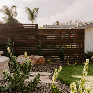 A residential yard renovation for clients who were done with their high maintenance lawn. Waterwise plants, a specially chosen sitting boulder, modern pathway and custom lighting system are just a few features neatly packaged into this San Diego front yard.